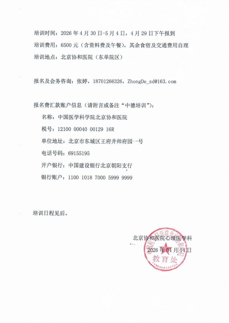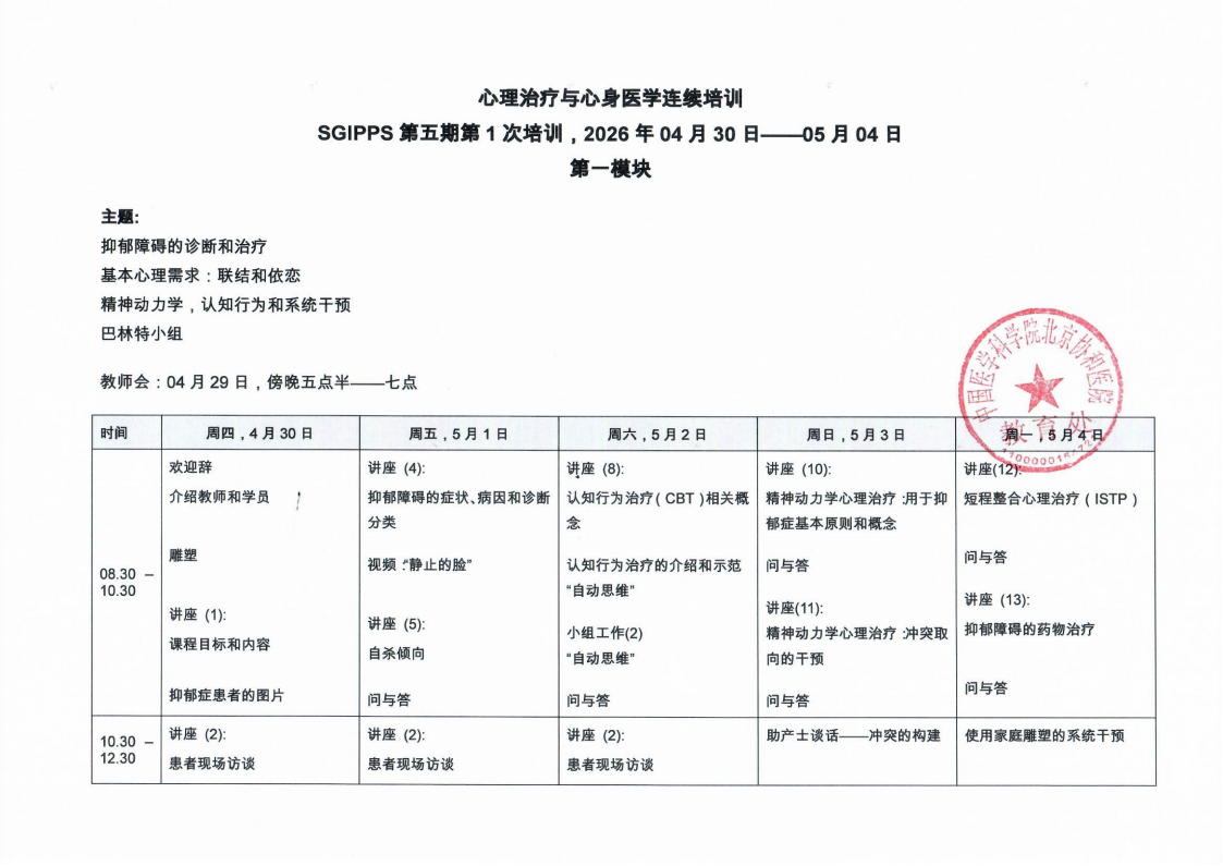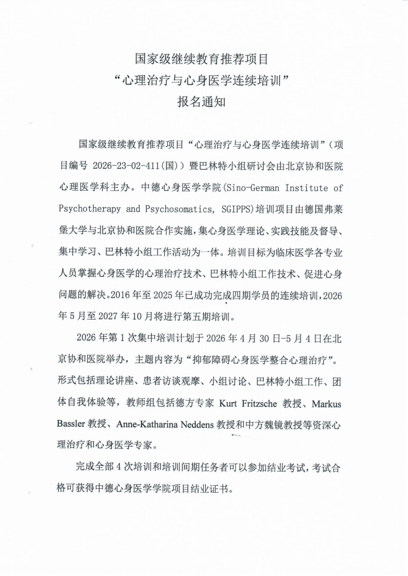 国家级继续教育推荐项目“心理治疗与心身医学连续培训”报名通知